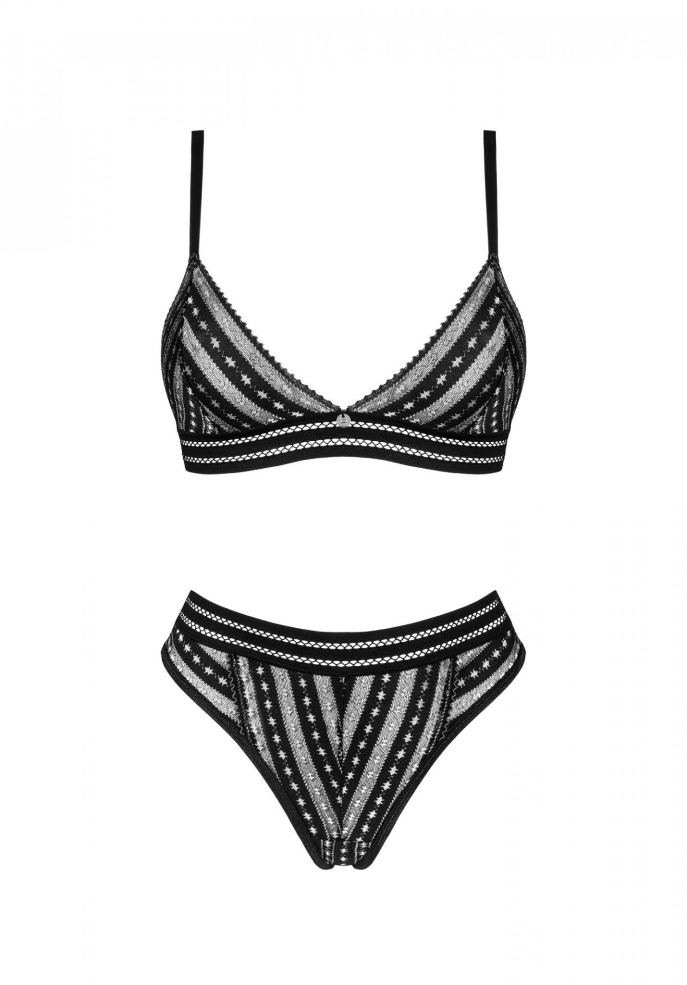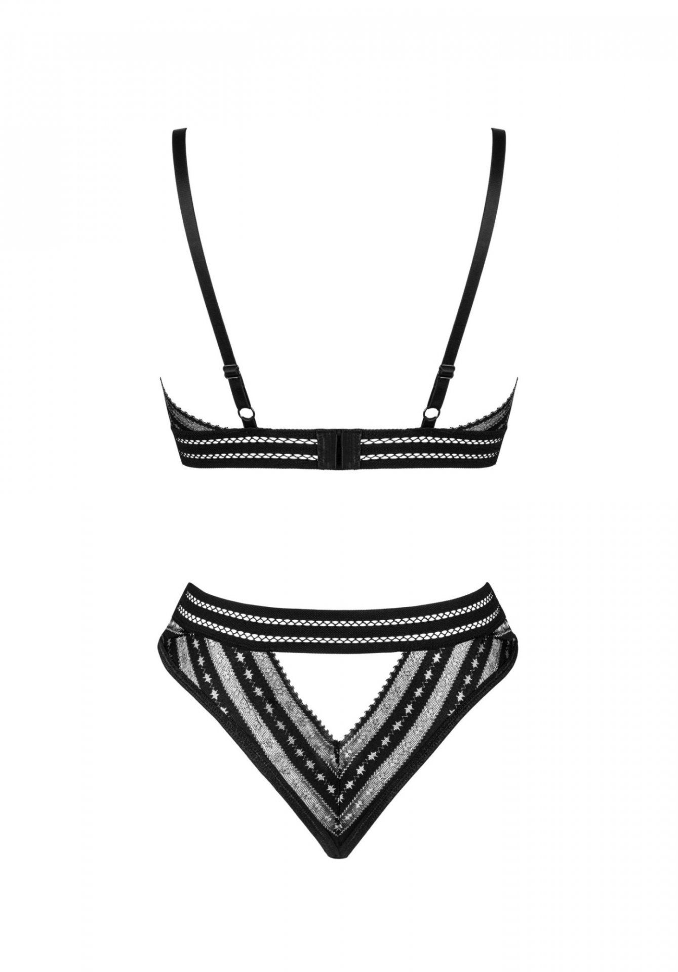 Biustonosz o trójkątnych miseczka zapewnia pełnię komfortu, a figi zdobione zmysłowym wycięciem na pośladkach rozpalają wyobraźnię i zachęcają do rozkosznych chwil w sypialni