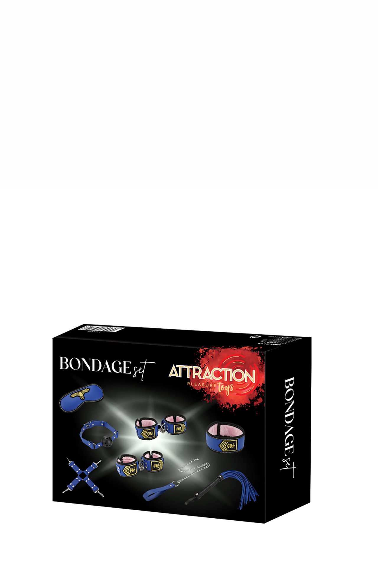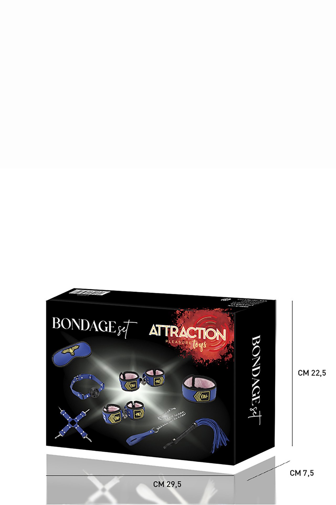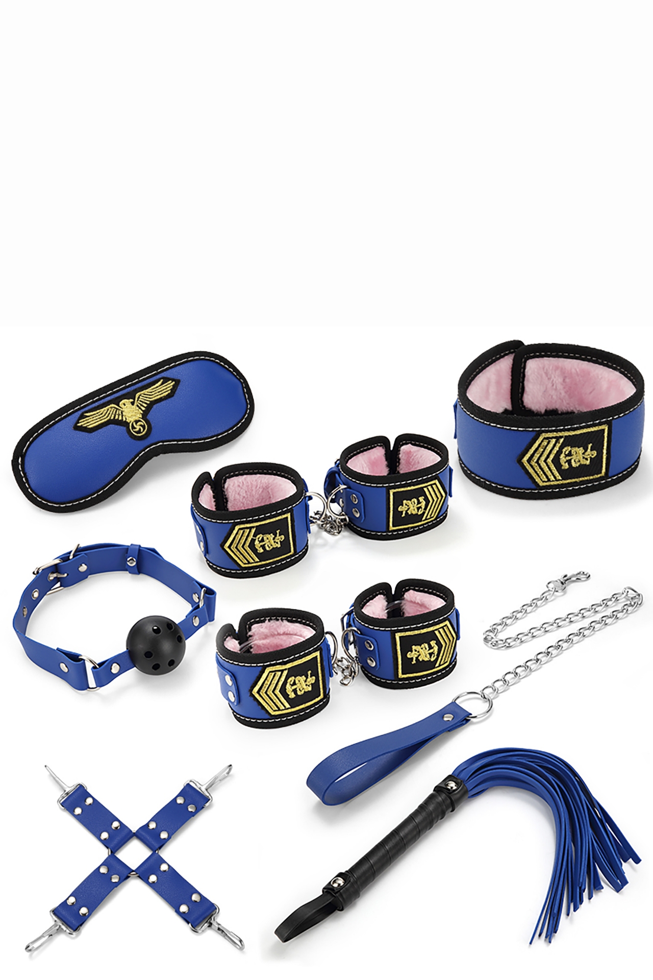 Attraction bondage set Air Force, containing 8 items:Wrist cuffs: 31 cm long, 6 cm wideAnkle cuffs: 37 cm long, 6 cm wideMask: 29 cm long, 7,5 cm wideHog tie: 26 cm longWhip: 44 cm long, 3,2 cm wideCollar: 45 cm longRope: 62 cm longBall gag: 56 cm longMade of PVC, metal, elastic band, plush, ribbon,plastic and woodWeight 790 grams