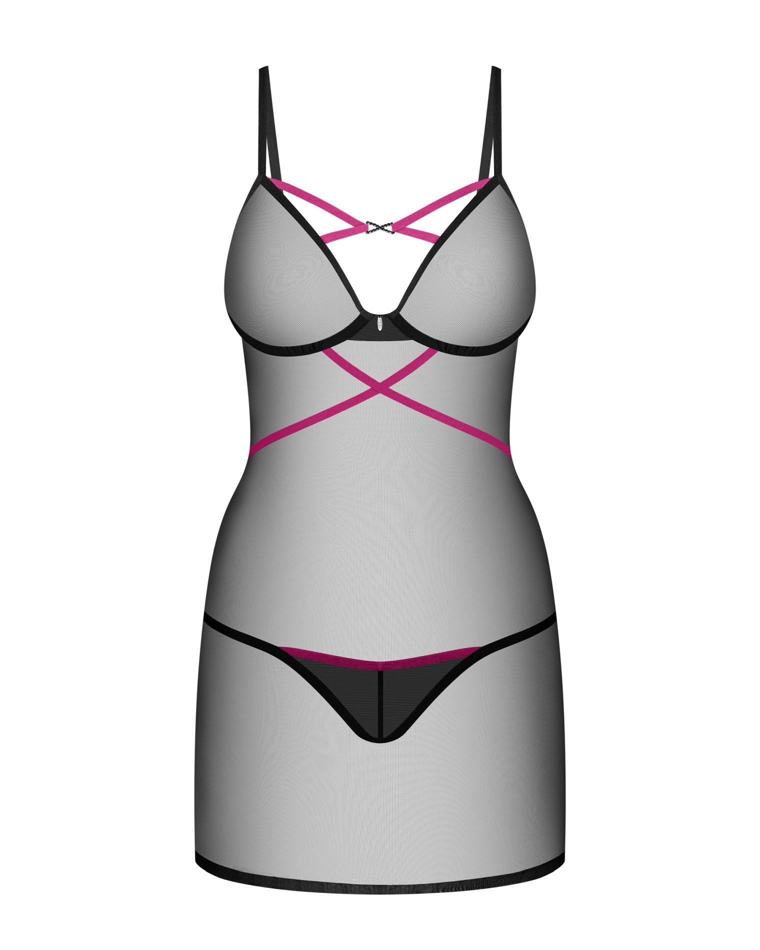 – komplet w czarnym kolorze – stringi oraz koszulka nocna- fiszbiny w miseczkach- prześwitująca i przyjemna w dotyku tkanina- możliwość regulacji ramiączek- kilkustopniowe zapięcie z tyłu- błyszcząca zawieszka z czarnymi cyrkoniami- 94% poliamid, 6% elastan – zaprojektowano w UE- bez zawartości niklu
