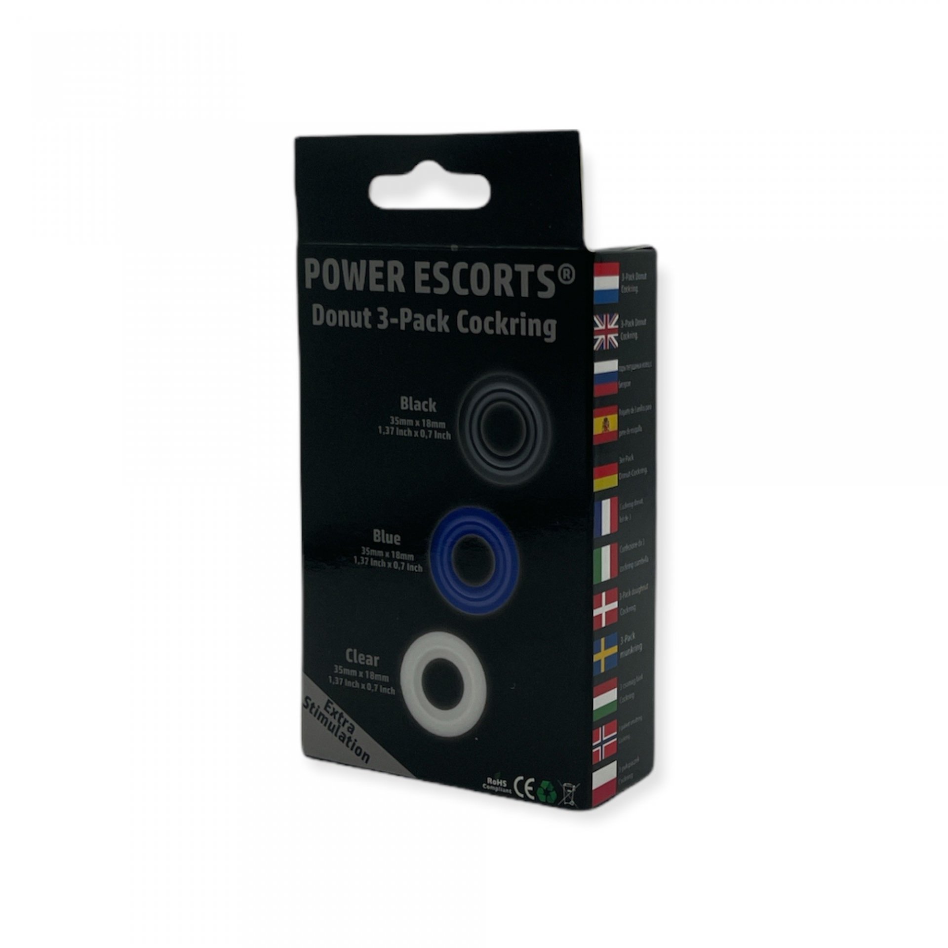 Power Escorts – BR272 – Donut Cockring 3 Pack – Super rozciągliwy – 3 kolory niebieski / przezroczysty / czarny – atrakcyjne kolorowe pudełko